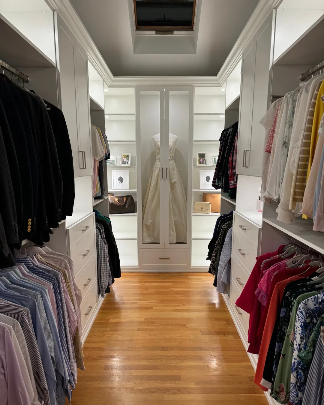 Custom Walk-In closets are built with premium composite wood components and high quality laminate or woodgrain finishes designed for long lasting beauty and strength. Shelves are engineered to support stacks of sweaters, denim, handbags, and storage boxes without bowing, while vertical panels provide structural stability and a clean built in look.